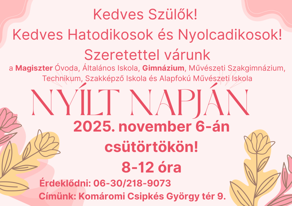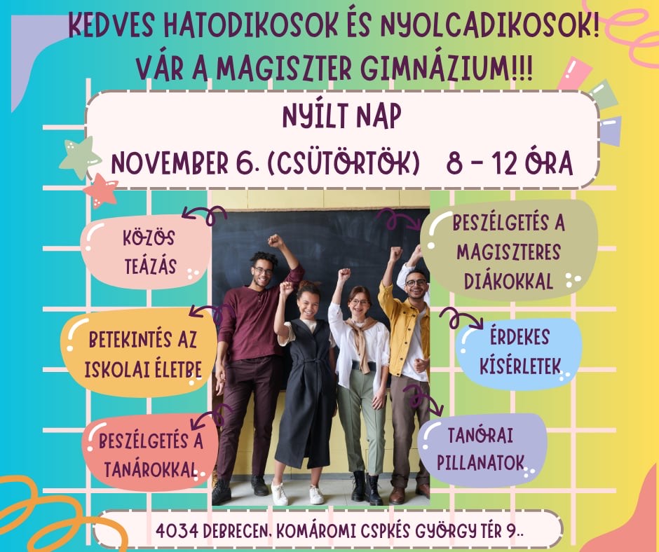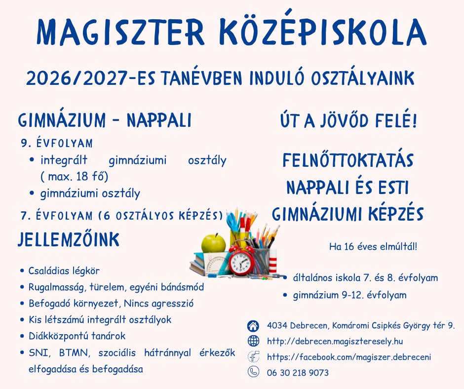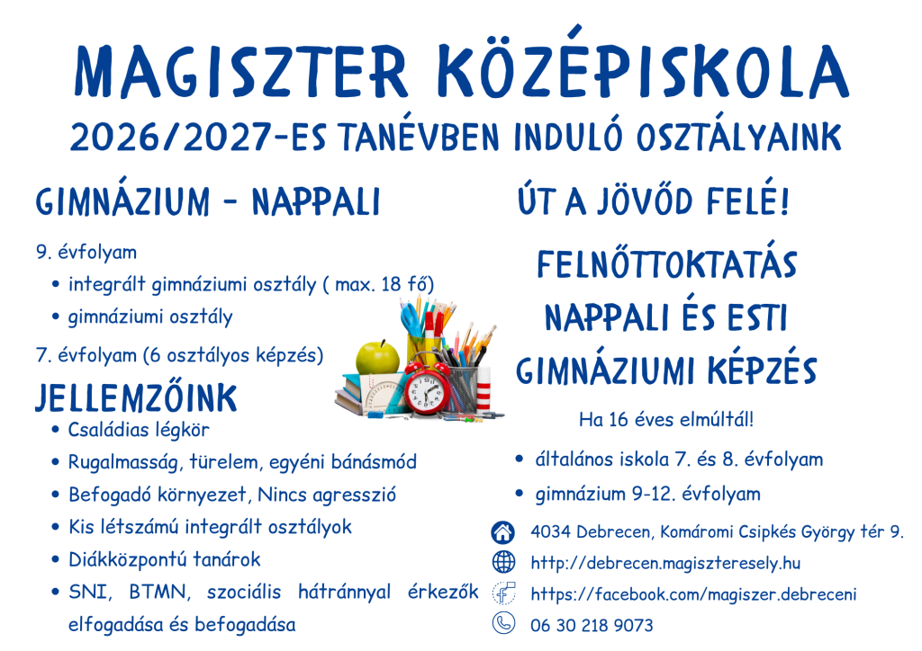Kedves Diákok, Szülők és Érdeklődők! Örömmel értesítünk mindenkit, hogy a debreceni Magiszter Gimnázium új helyszínen folytatja munkáját! Új címünk: 4034 Debrecen, Komáromi Csipkés György tér 9. Tanévnyitó ünnepség: 2025. szeptember 1. (hétfő) 9:00 óra Gyülekező: az iskola udvarán Várunk szeretettel minden diákot és hozzátartozót, hogy együtt indítsuk a 2025/26-os tanévet!